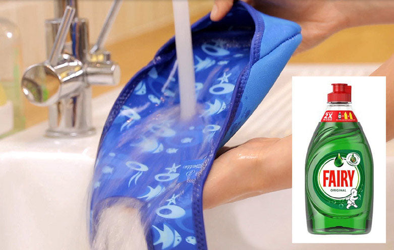 For our neoprene products we recommend hand-washing after every meal; wash off any excess food under the tap using warm running water, add washing-up liquid or clothes washing detergent, gently rub and agitate the material to remove all traces of food and dribble, rinse off thoroughly under warm running water, then dry with the pocket folded outwards.